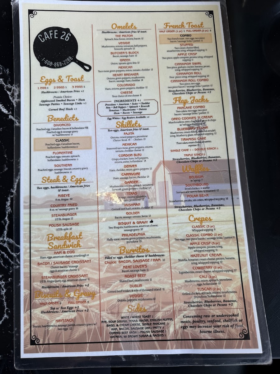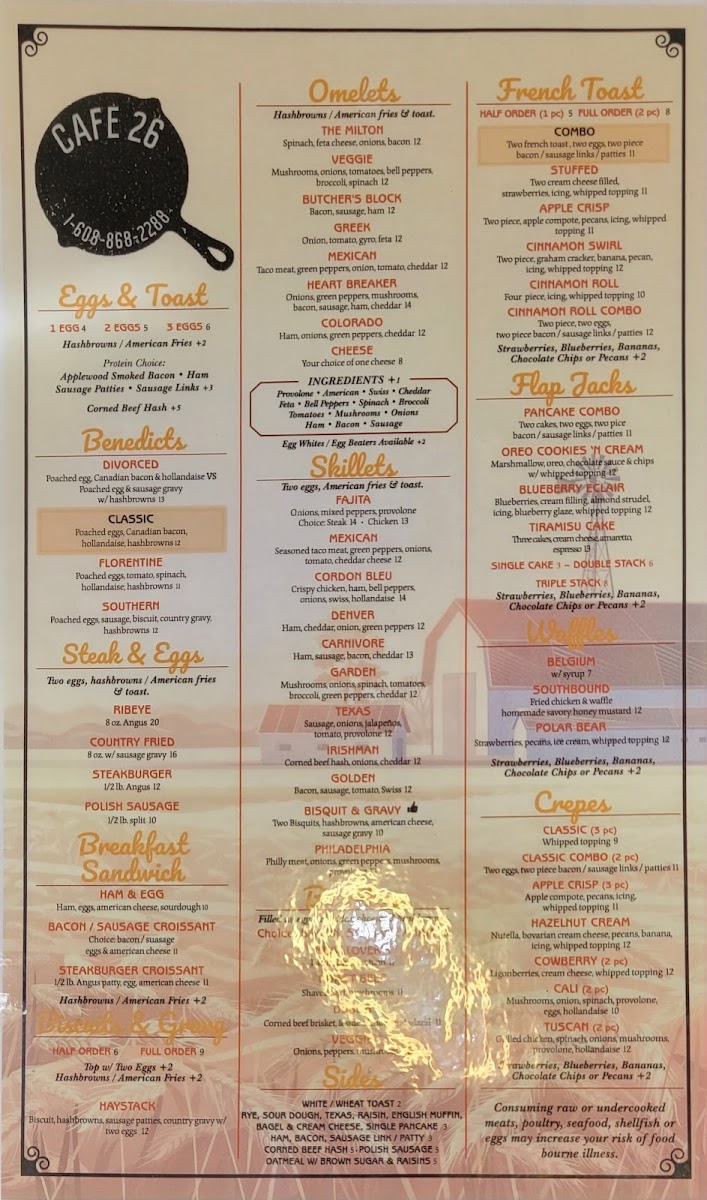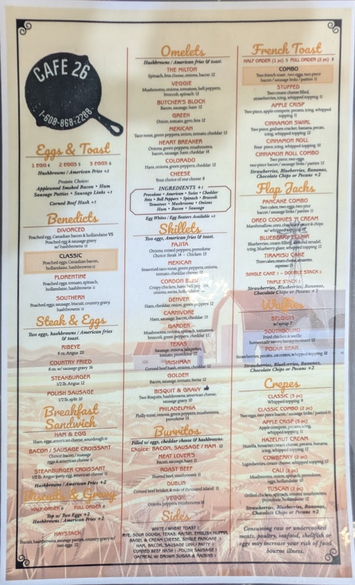 Discover Cafe 26 in Milton, WI—a cozy spot serving delicious meals and warm vibes. Perfect for casual dining, great coffee, and friendly service that keeps you coming back!
